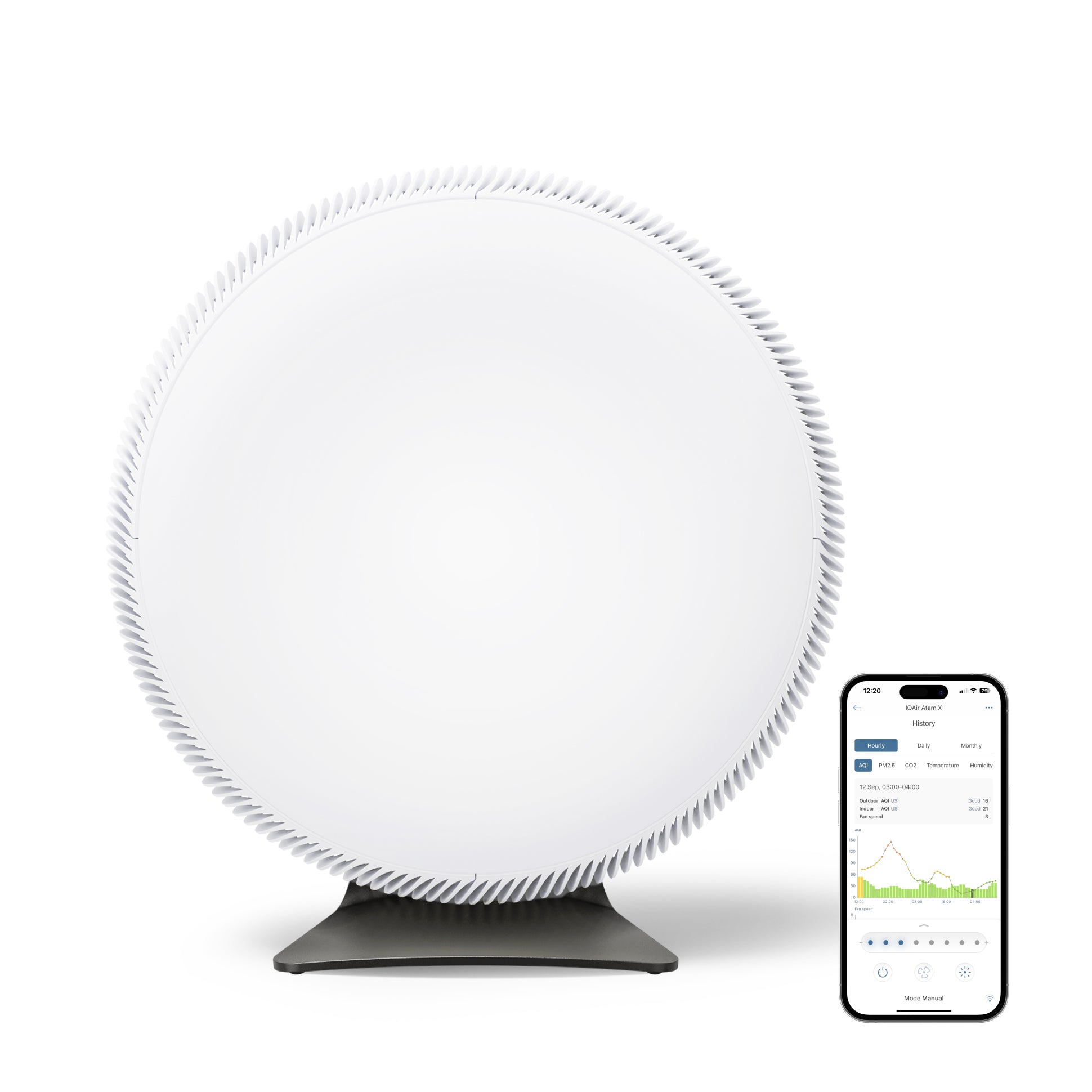 Adjust settings effortlessly with a gentle tap or take full control from your smartphone. Atem X’s sleek touch interface lets you manage fan speed, lighting, and smart modes directly on the device, while the IQAir app gives you the convenience of monitoring and controlling your air purifier from anywhere. Clean lines, effortless operation, and smarter air—right at your fingertips.